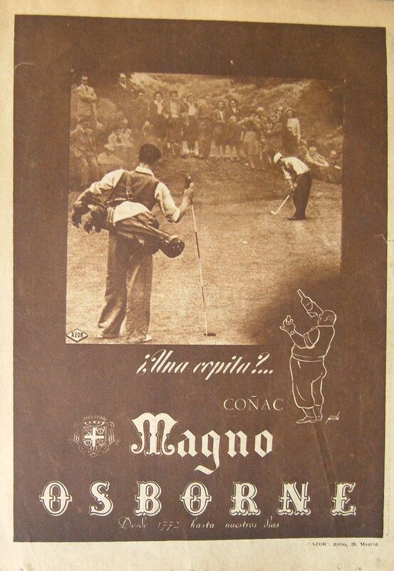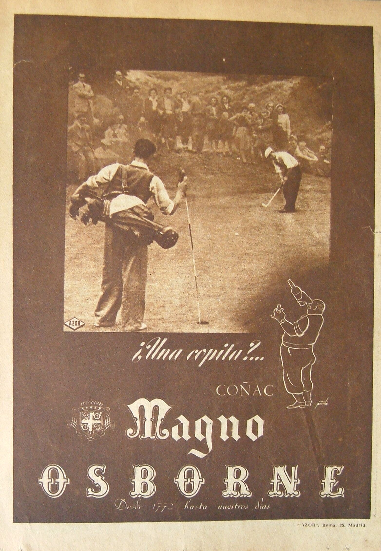 - Cartel compuesto por la imagen real de golfista con su cady jugando en el campo rodeados por un grupo de aficionados que siguen atentamente el juego, el cady con la bolsa de palos en la espalda mira atentamente a su compañero que intenta meter en el hoyo la bola a cierta distancia.