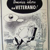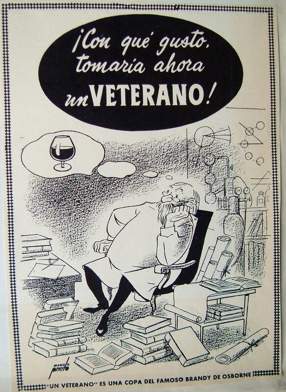 - Boceto a lápiz de cartel de Veterano, con la imagen de un sabio matemático sentado en un sofá descansando rodeado por del desorden de libros y planos dentro de su orden, con una pizarra al fondo con apuntes de sus estudios, de su cabeza sale un bocadillo que refleja el deseo de beberse una copa de Veterano.