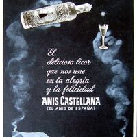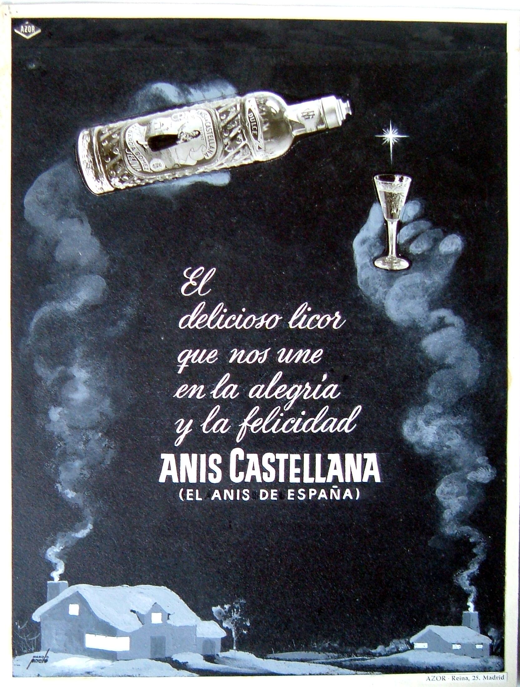 - Cartel de fondo oscuro con la imagen nocturna de dos casas con luz en las ventanas y cubiertas de nieve, de sus chimeneas sale humo que va ascendiendo convirtiéndose en unas manos que sujetan una botella de anís y una copa entre medias de las dos manos la leyenda del cartel.