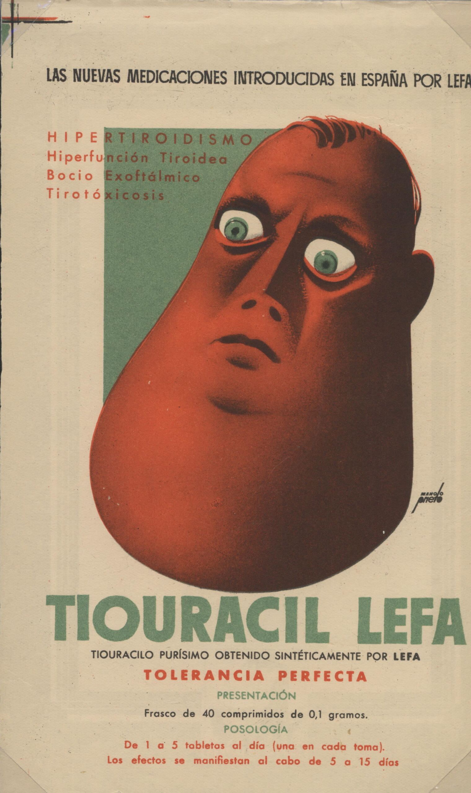 - Sobre un fondo claro, la imagen de una gran cabeza en tonos rojos, exagerando el problema del hipertiroidismo que se refleja en la papada que presenta la figura, en el resto del cartel los rótulos correspondientes a la publicidad anunciada en tonos verdes, rojos y negros.