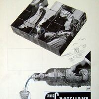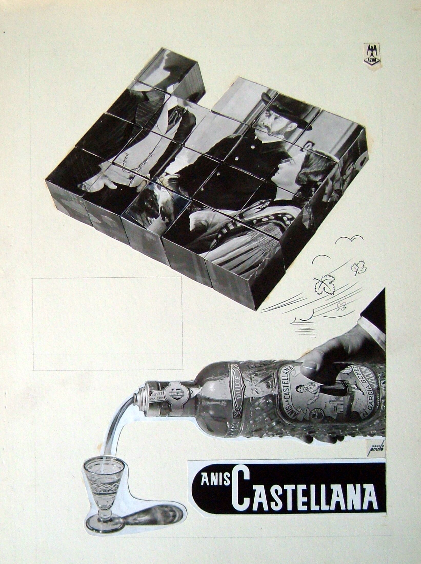- Cartel donde en primer término se aprecia el brazo de un hombre con una botella de anís llenando una copa, en un segundo plano un avión pequeño en pleno vuelo y una de las escenas “De lo que el viento se llevó” delimitada por cubos de cuatro caras.