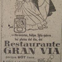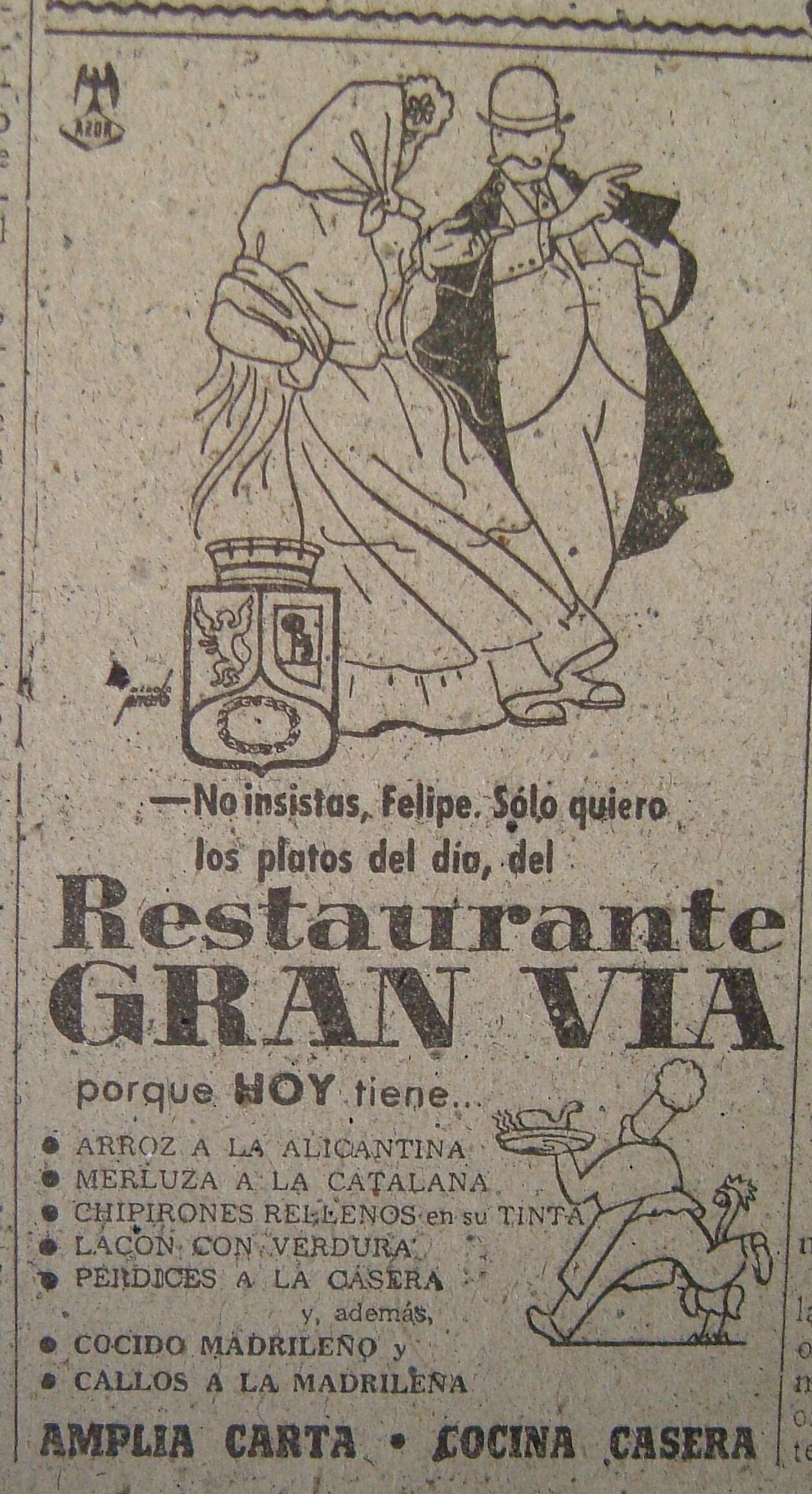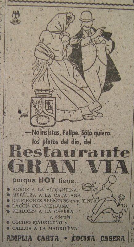 - Imagen de un anuncio de prensa, con la figura de una pareja de chulapos, donde el hombre señala en una dirección con su brazo y la mujer le contesta que no insista y le diga los platos de la carta del restaurante Gran Vía.