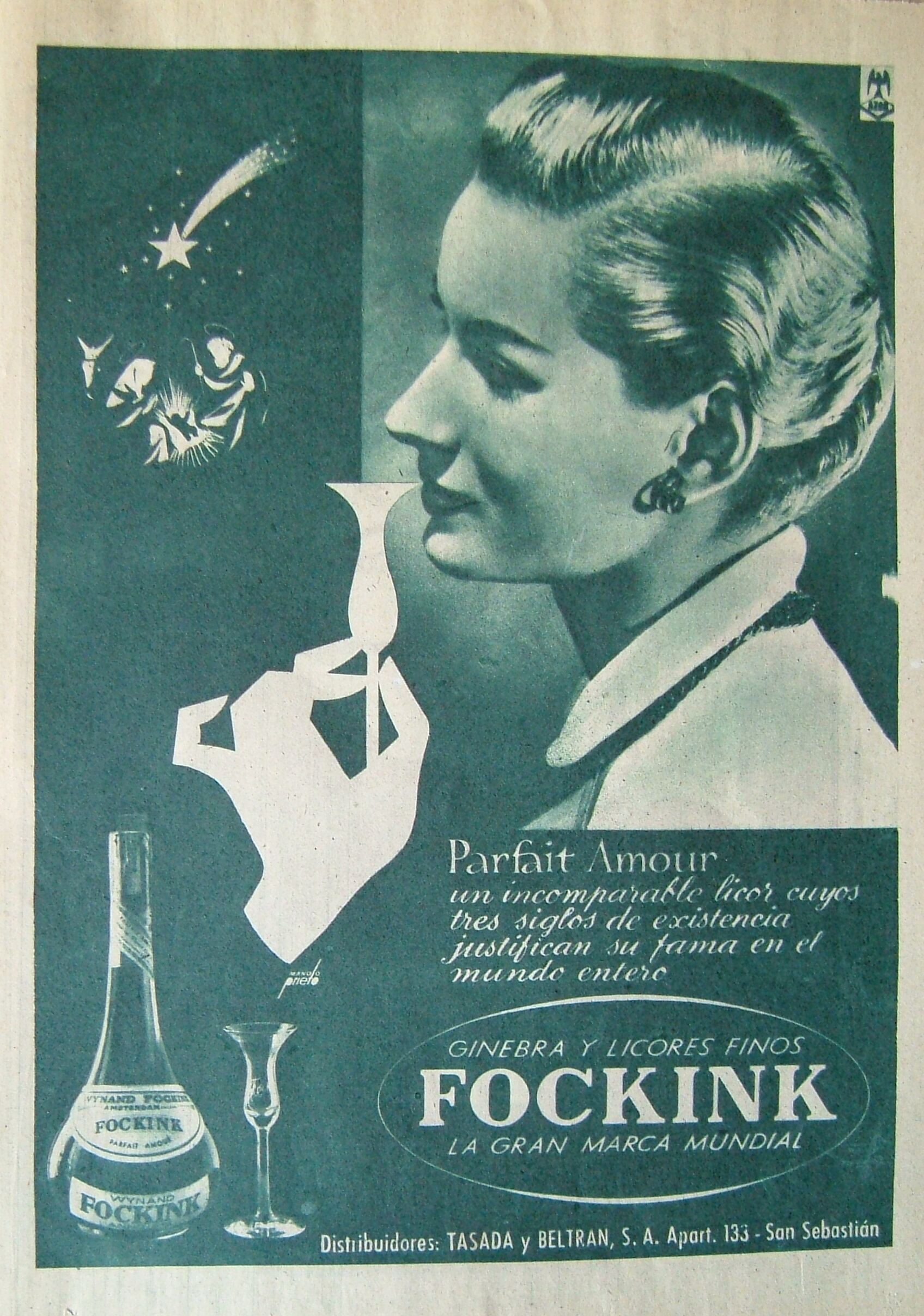 - Cartel con la imagen fotográfica de la cabeza de una mujer junto al dibujo en blanco de una mano que sujeta una copa a la altura de su boca, junto a ella la silueta en blanco de un grupo de personas bailando en una fiesta, debajo de la composición, el rótulo correspondiente al anuncio del licor.