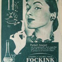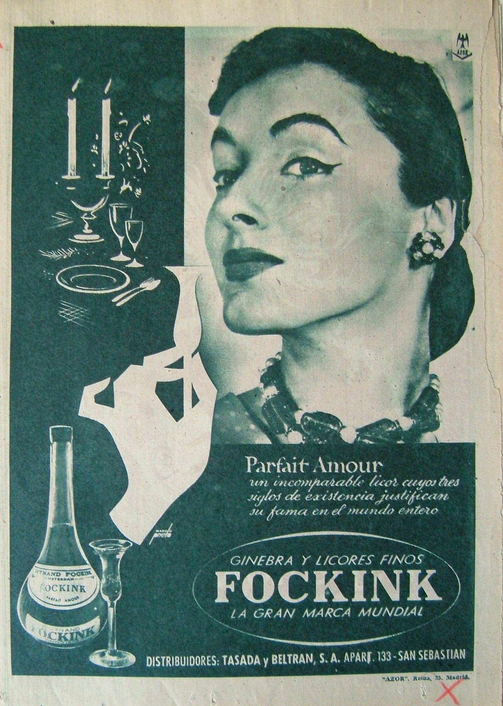 - Cartel con la imagen fotográfica de la cabeza de una mujer junto al dibujo en blanco de una mano que sujeta una copa a la altura de su boca, junto a ella la silueta en blanco de un grupo de personas bailando en una fiesta, debajo de la composición, el rótulo correspondiente al anuncio del licor.