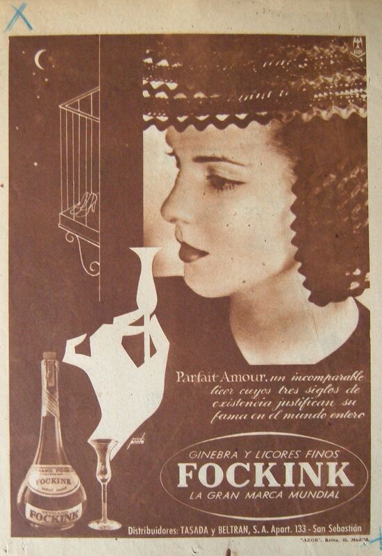 - Cartel con la imagen fotográfica de la cabeza con tocado de una mujer junto al dibujo en blanco de una mano que sujeta una copa a la altura de su boca, debajo de la composición, el rótulo correspondiente al anuncio del licor.