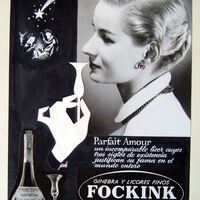 - Cartel con la imagen fotográfica de la cabeza de una mujer junto al dibujo en blanco de una mano que sujeta una copa a la altura de su boca, junto a ella la silueta en blanco de de la Sagrada Familia en la Noche de Navidad, el rótulo correspondiente al anuncio del licor.