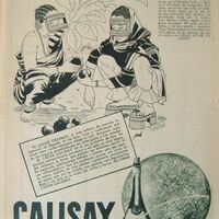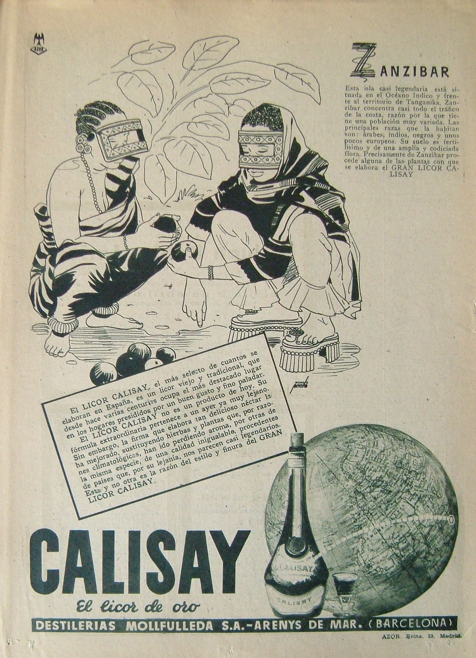 - Cartel con la imagen de dos personajes vestidos con trajes típicos de Zanzíbar, lejana región del Océano Índico, debajo la imagen de un globo terráqueo junto a una botella de Calisey.