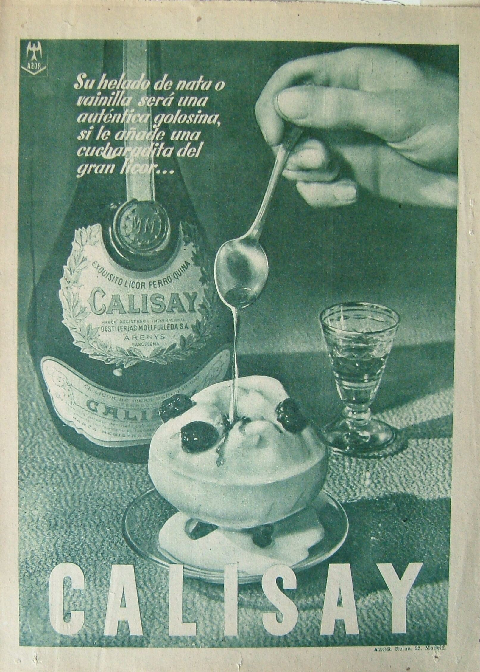 - Cartel con la imagen fotográfica de una mano que con una cuchara vierte sobre una copa de helado licor Calisay dándole el toque final, debajo las letras del licor en grande y en blanco.