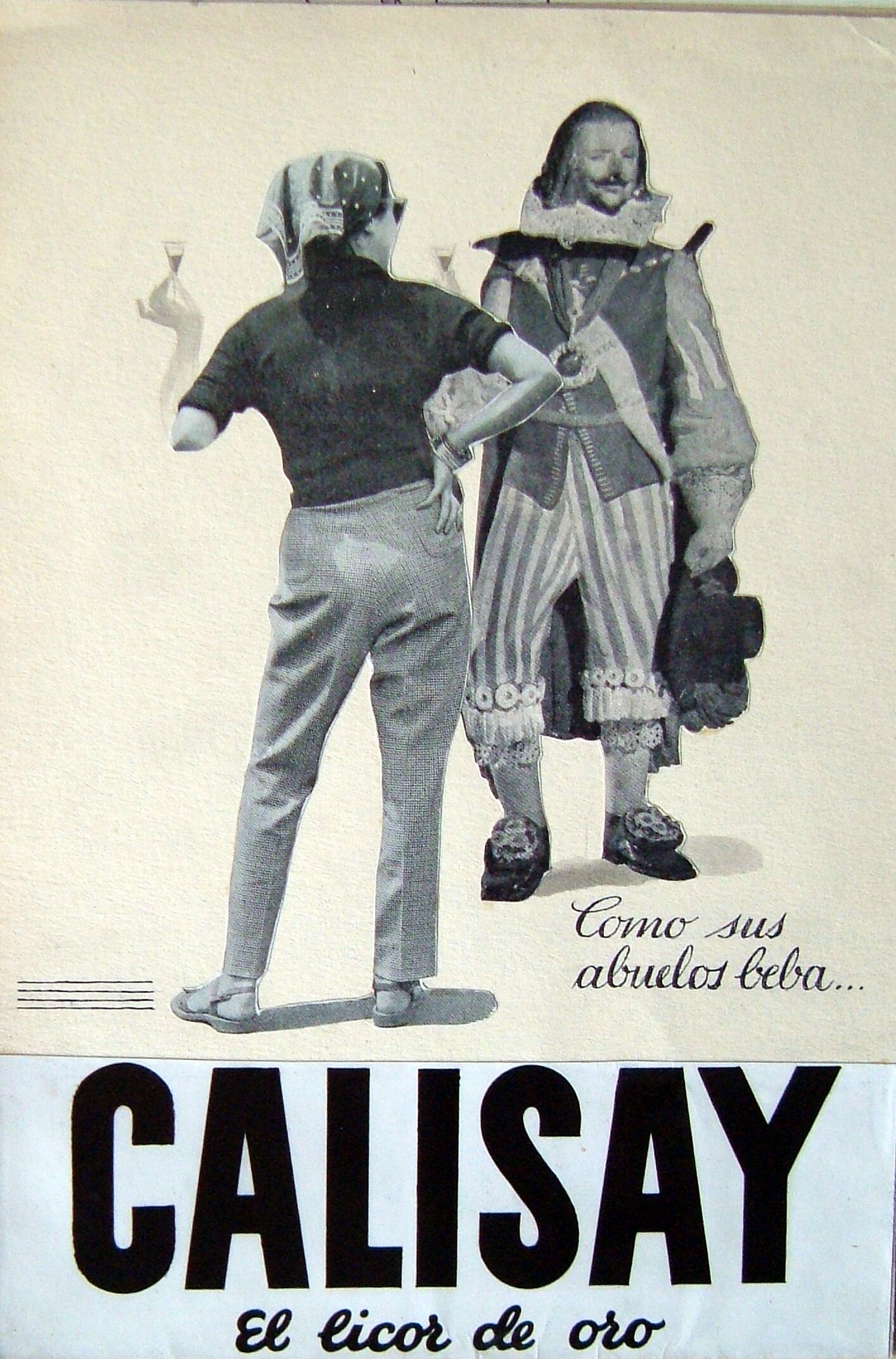 - Imagen fotográfica de una mujer actual con pantalones de espaldas al espectador que mientras sujeta una copa en su mano observa la figura de un caballero de tiempos pasados, junto a las figuras las letras donde se puede leer “como sus abuelos beba… Calisay”.