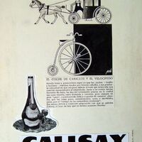 - Cartel de Calisay, en primer lugar en la parte superior del cartel el dibujo de un caballo tirando de un carruaje conducido por un cochero, debajo la imagen de una botella del licor anunciado junto al boceto de la leyenda y el rótulo del cartel.
