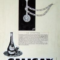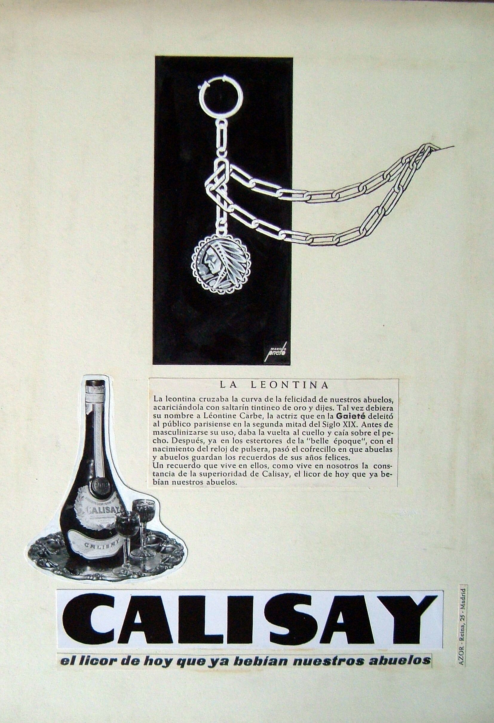 - Imagen central sobre fondo negro de una Leontina en blanco sujeta por una cadena, debajo la leyenda que describe el origen y evolución de este colgante, debajo la fotografía de una botella y el rótulo Calisay.
