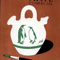 - Sobre un fondo de color tierra oscuro, la imagen central de un botijo en blanco con una pareja de pingüinos en verde junto a un pincel de mango negro cuyos pelos están cubiertos de pintura verde.