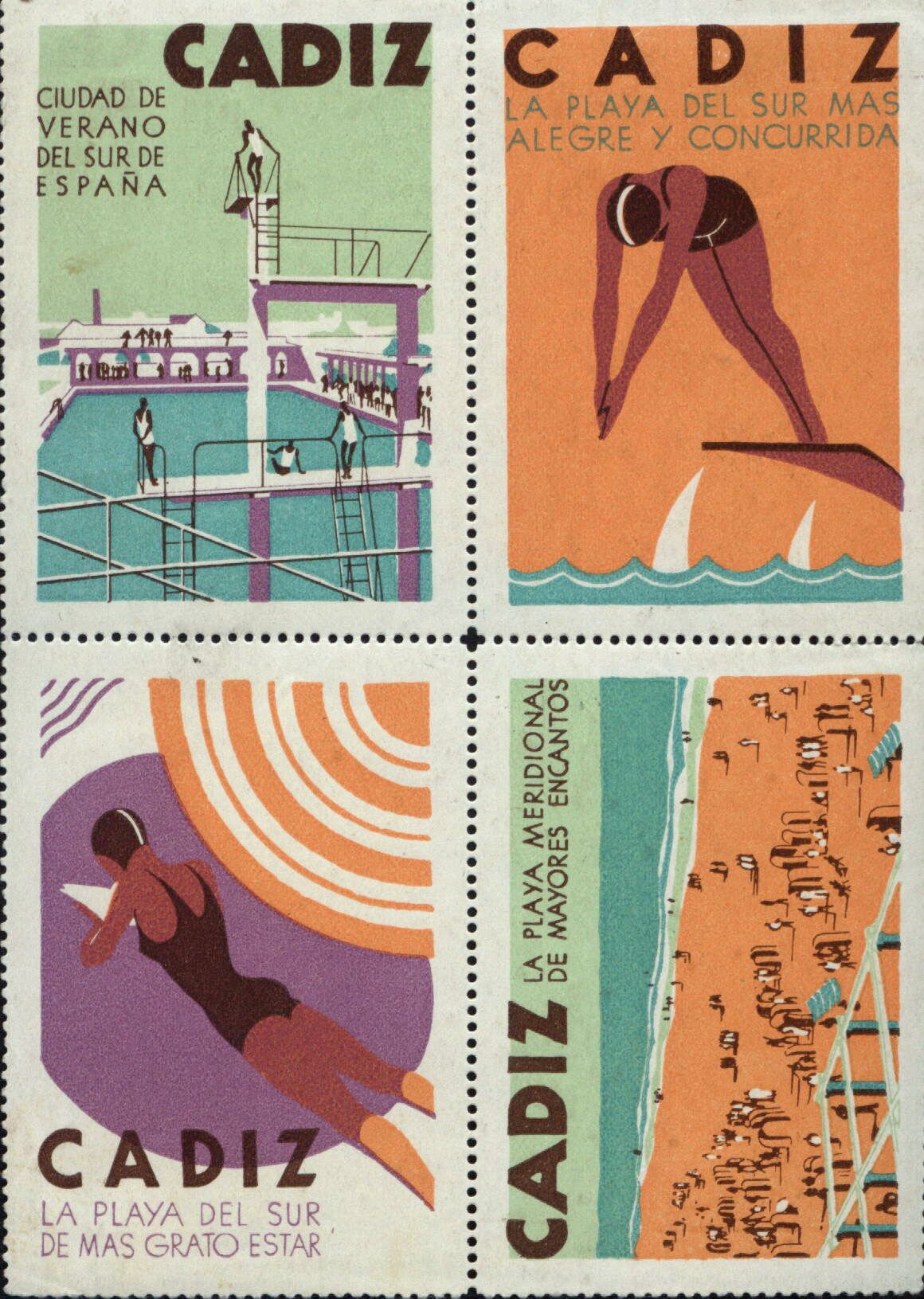 - Tira de cuatro sellos de la provincia de Cádiz, con una primera imagen de una piscina olímpica, a su lado una bañista tirándose desde un trampolín, debajo una mujer contraje de baño oscuro tumbado bajo una sombrilla leyendo un libro, por último el dibujo de una de las maravillosas playas gaditanas.