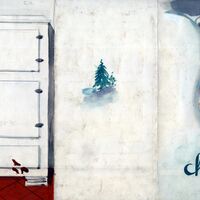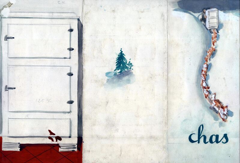 - Escena compuesta por tres imágenes correlativas relacionadas entre sí, los dos primeros dibujos representa una nevera blanca, objeto del anuncio, sobre un suelo rojo y a su lado la leyenda publicitaria, por último la imagen de una hilera de perros siberianos que tiran de la nevera y detrás de ellas un hombre que asegura la sujeción en el recorrido.