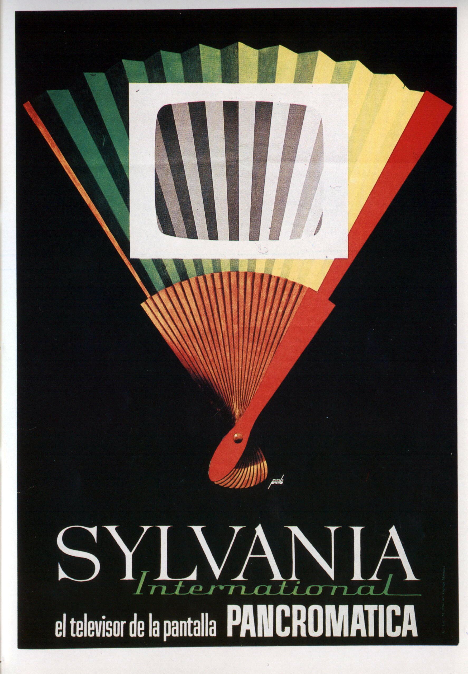 - Cartel publicitario de una marca de televisiones, con el marco en blanco de la pantalla sobre un fondo multicolor en forma de abanico, pero que dentro de la pantalla sólo se puede ver en blanco y negro.
