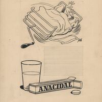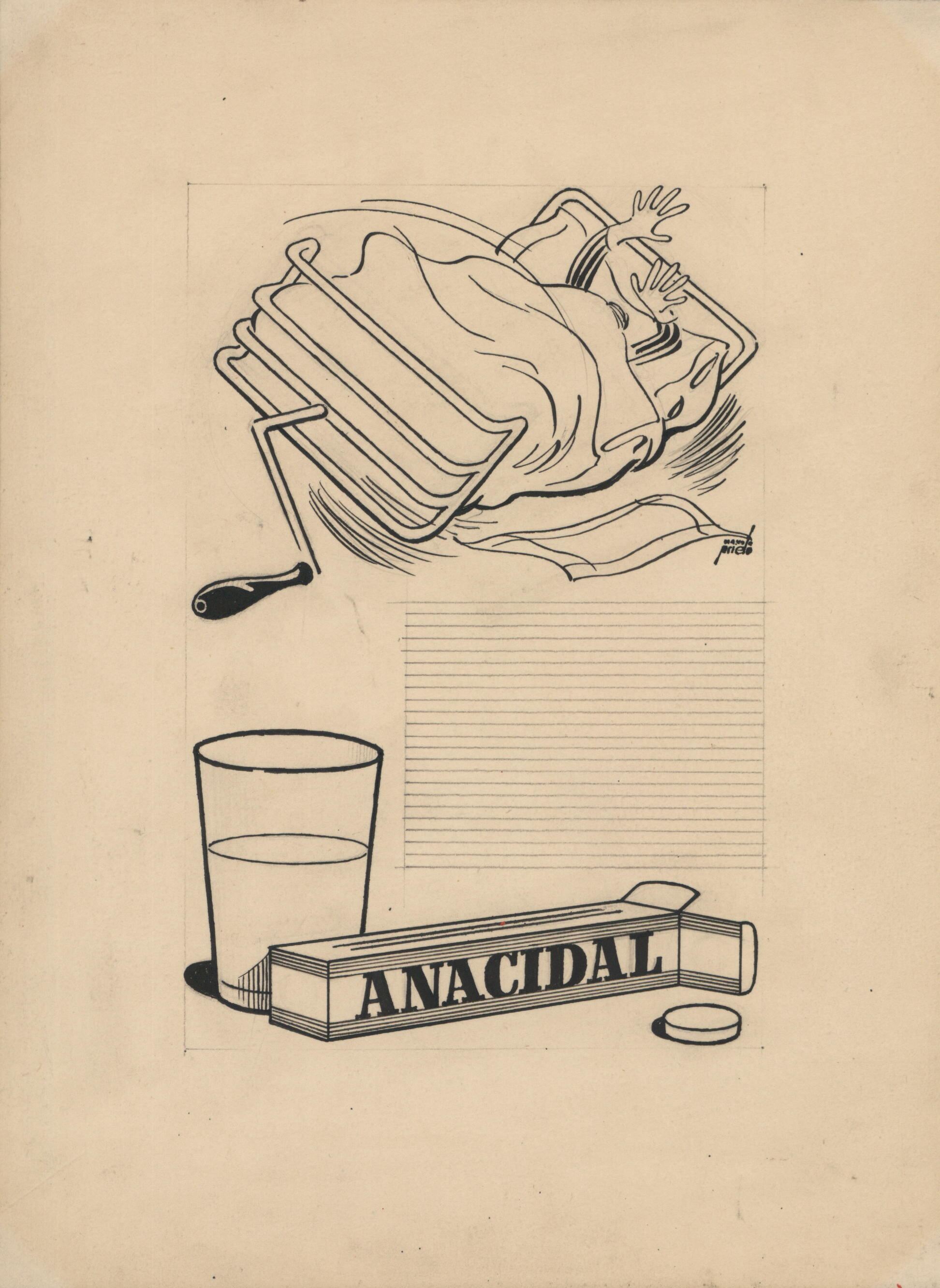 - Imagen de una cama movida por una manivela con los brazos de un señor como si todo le diese vueltas, debajo el boceto de las líneas de la leyenda correspondiente, y junto a ella un vaso lleno de agua y una caja de Anacidal.