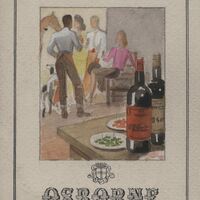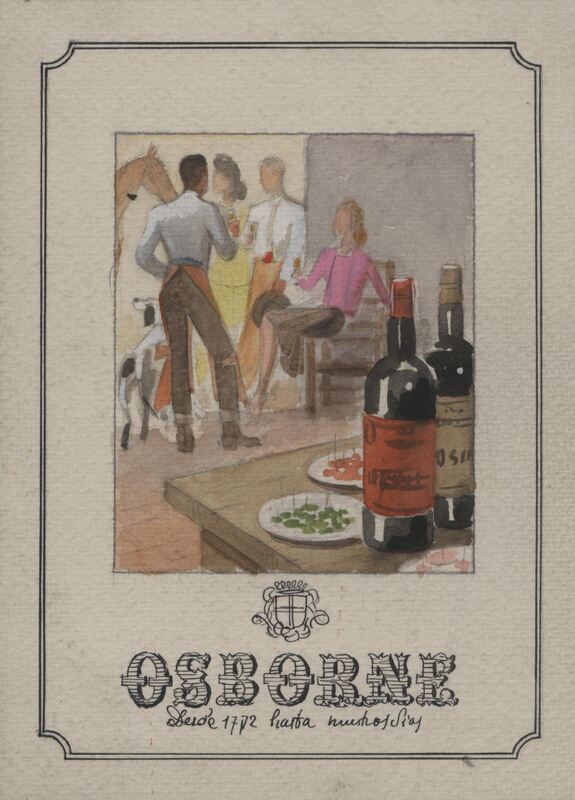 - Cartel enmarcado de las bodegas Osborne, donde en primer término aparece la esquina de una mesa con dos botellas y unos platos de canapés, al fondo la escena de dos parejas charlando mientras toman una copita, las mujeres una ellas sentada y la otra junto a un caballo y un perro y los hombres van vestidos de corto.