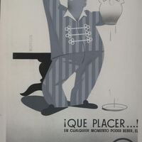 - Cartel publicitario de Licor 43 en tonos grises con dos toques de negro en la silueta de la mesa y las zapatillas que lleva el señor, aparece en la escena la figura de un señor en pijama sujetando en una de sus manos un botijo y en la otra un vaso de donde bebe, debajo la leyenda correspondiente al anuncio.
