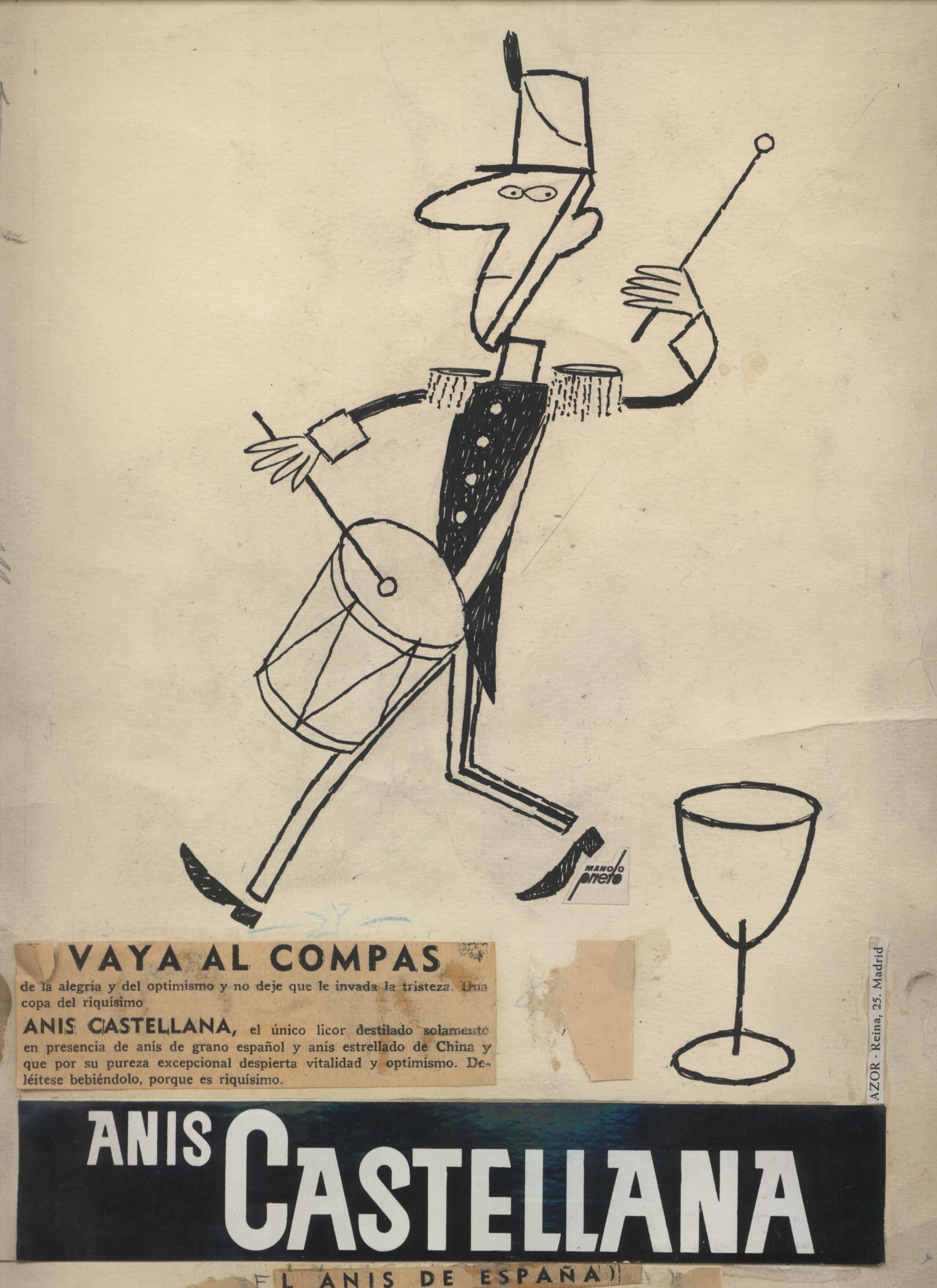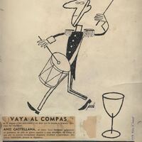 - Cartel que representa la figura de un tamborilero, tocando el tambor mientras anda junto a él la silueta de una copa donde a su misma altura aparece un recorte de periódico que dice “Vaya al compás”, debajo los rótulos del anuncio.