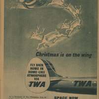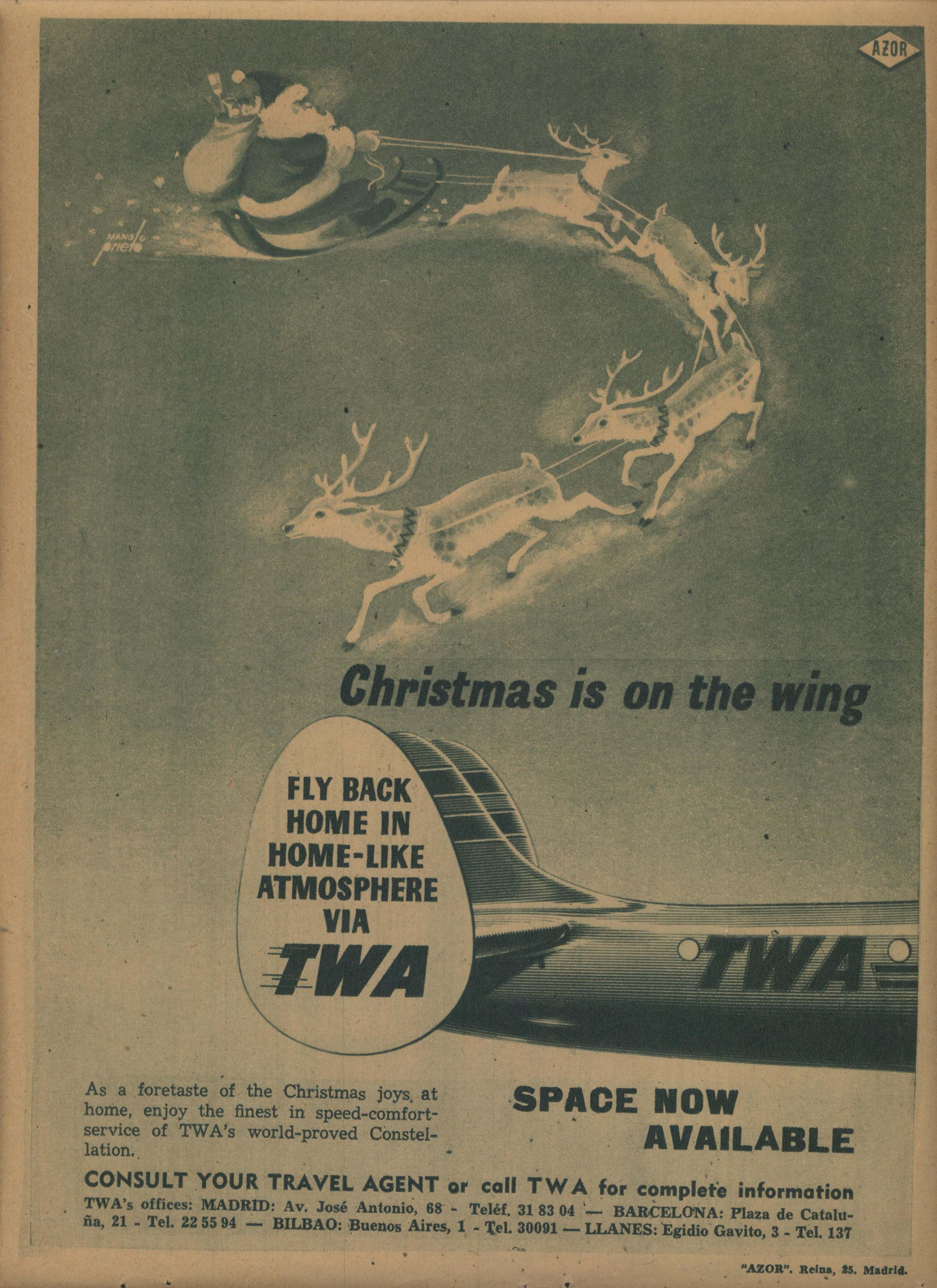 - Cartel publicitario navideño de la compañía aérea Twa, donde se representa la cola del avión donde se puede leer el rótulo correspondiente al anuncio junto a la figura de Papa Noel tirado por sus renos.