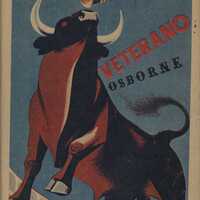 Sobre un fondo azul ocupando la parte inferior del cartel el semicírculo de las gradas del ruedo, se representa un toro saltando para alcanzar con el morro una botella de Veterano Osborne. No es una obra original del artista, desde el punto de vista material, sino el recorte publicitario de un anuncio aparecido en la presa.