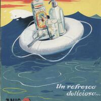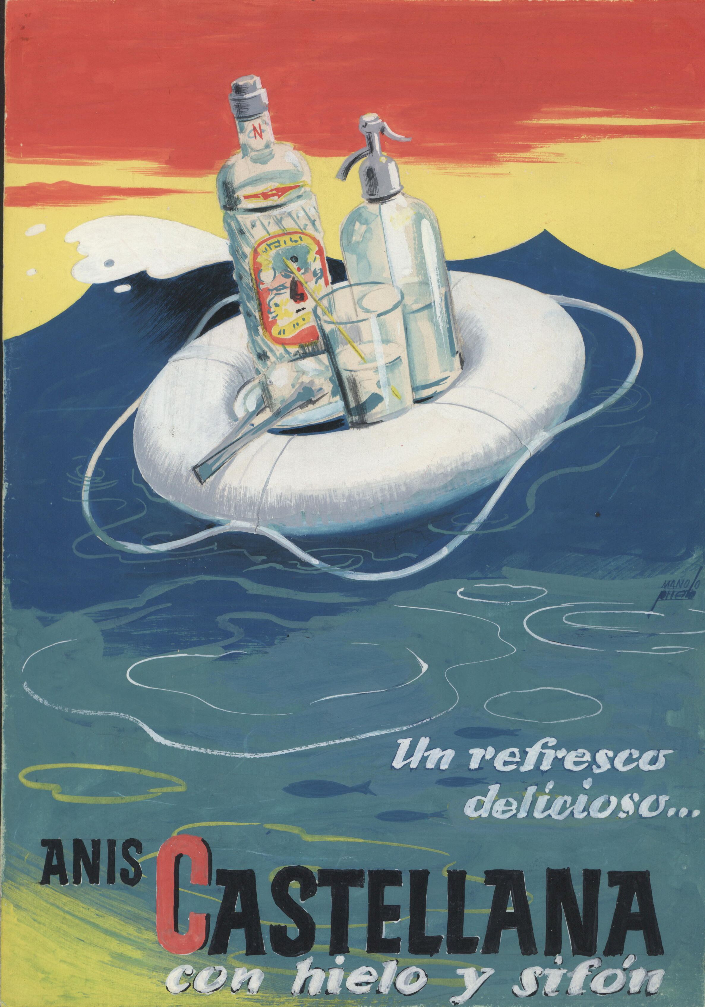 - Cartel con un salvavidas blanco en cuyo interior se aprecia la imagen de una botella de anís, otra de soda y un vaso con hielo en alta mar en la cresta de una ola, con un fondo compuesto por los vivos colores de un atardecer.Original para anuncio de Anis Castellana.