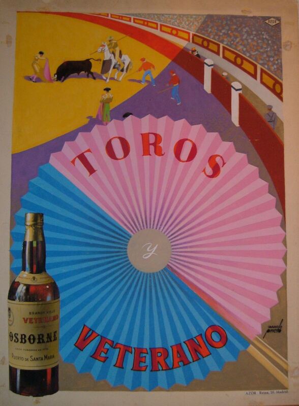 Cartel donde ocupando parte esencial de la escena la imagen de una sombrilla de papel mitad rosa mitad azul, con letras en rojo donde se lee toros y Veterano, como fondo el ruedo con el toro, el torero y su cuadrilla, y en un primer término situado en la esquina inferior izquierda una botella de Veterano Osborne. No es una obra original del artista, desde el punto de vista material, sino el recorte publicitario de un anuncio aparecido en la presa.