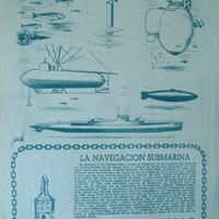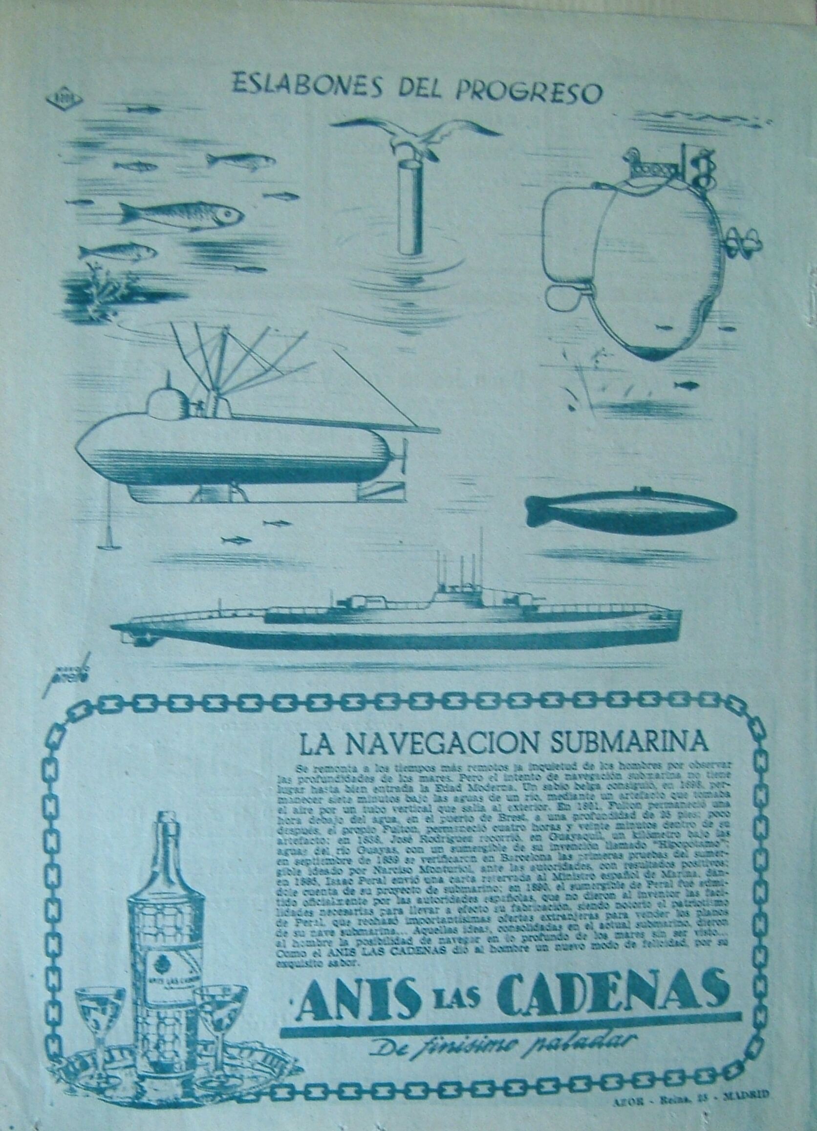 - Cartel donde en la parte superior aparece un letrero que dice “eslabones del progreso”, debajo composición de varios objetos relacionados con el mundo submarino, y en la parte inferior un recuadro formado por una cadena la imagen de una botella de anís y unas copas junto a una leyenda escrita con letra de imprenta.