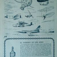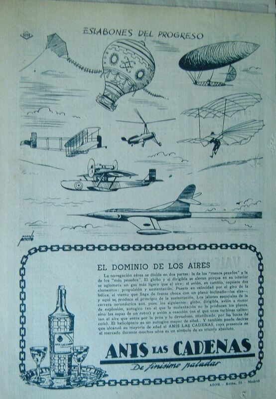 - Cartel donde en la parte superior aparece un letrero que dice “eslabones del progreso”, debajo composición de varios objetos relacionados con el mundo aéreo, y en la parte inferior un recuadro formado por una cadena la imagen de una botella de anís y unas copas junto a una leyenda escrita con letra de imprenta.