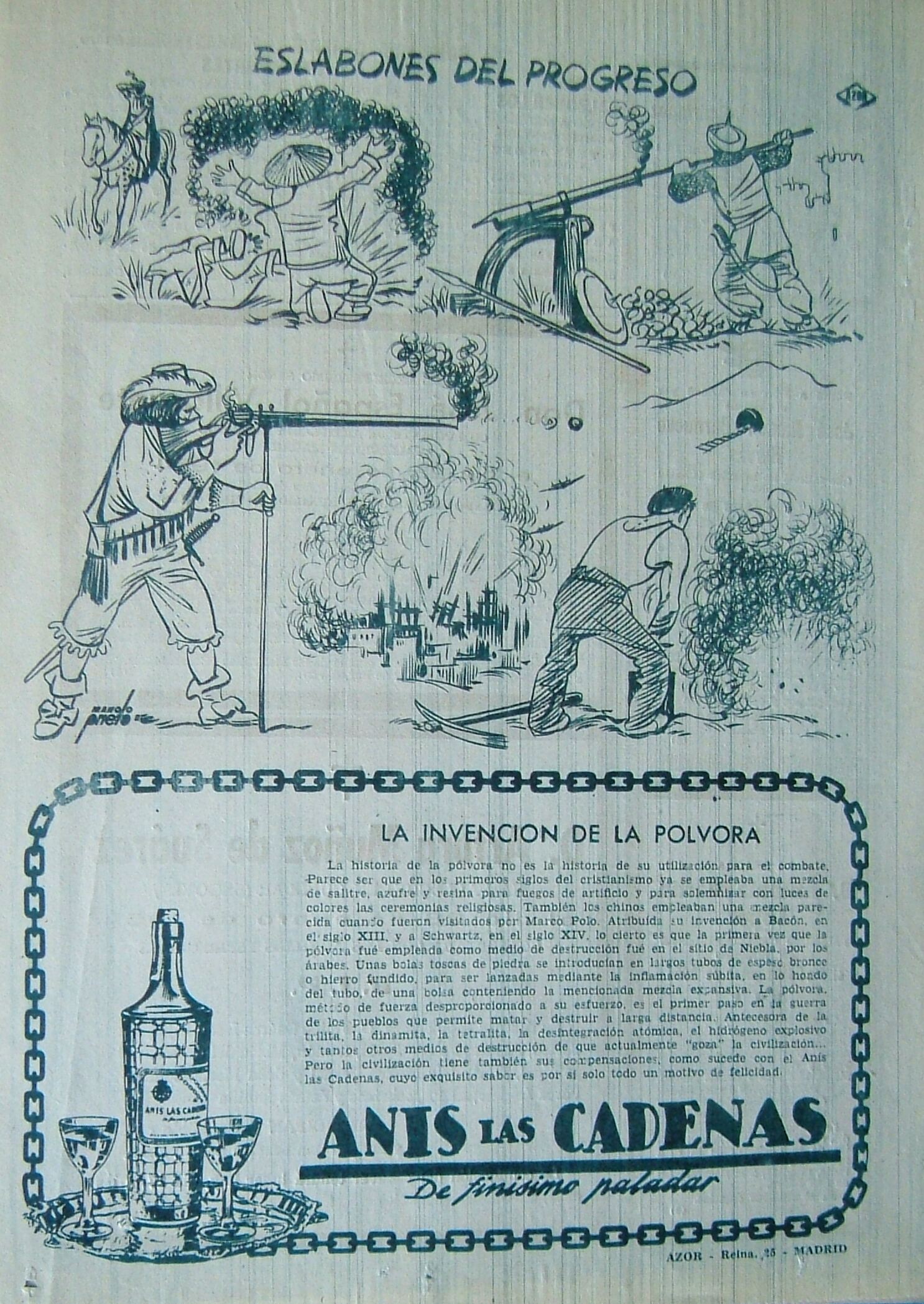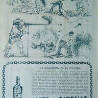 - Cartel donde en la parte superior aparece un letrero que dice “eslabones del progreso”, debajo composición de varios objetos relacionados con la invención de la pólvora, y en la parte inferior un recuadro formado por una cadena la imagen de una botella de anís y unas copas junto a una leyenda escrita con letra de imprenta.