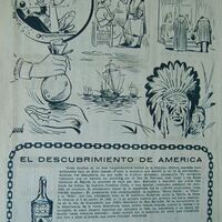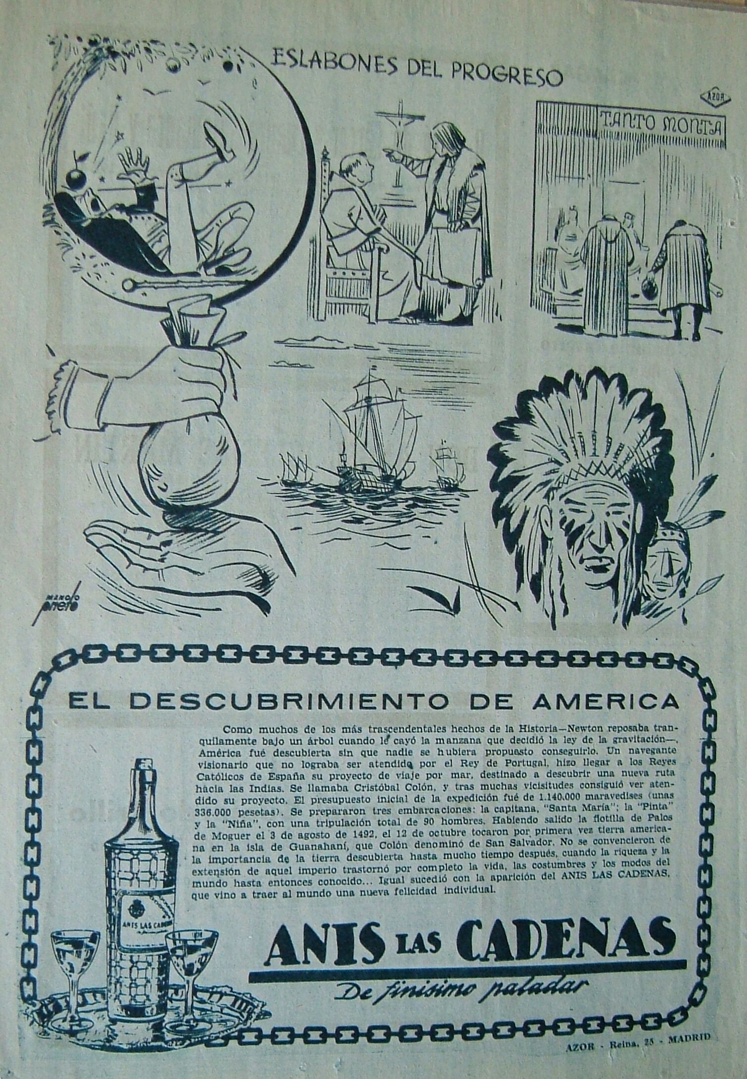 - Cartel donde en la parte superior aparece un letrero que dice “eslabones del progreso”, debajo composición de varios objetos relacionados con el descubrimiento de América, y en la parte inferior un recuadro formado por una cadena la imagen de una botella de anís y unas copas junto a una leyenda escrita con letra de imprenta.