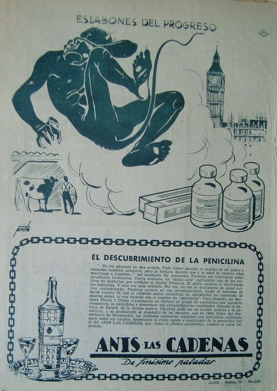 - Cartel donde en la parte superior aparece un letrero que dice “eslabones del progreso”, debajo composición de varios objetos relacionados con el descubrimiento de la penicilina, y en la parte inferior un recuadro formado por una cadena la imagen de una botella de anís y unas copas junto a una leyenda escrita con letra de imprenta.