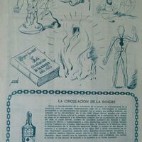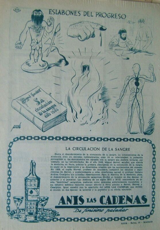 - Cartel donde en la parte superior aparece un letrero que dice “eslabones del progreso”, debajo composición de varios objetos relacionados con la circulación de la sangre, y en la parte inferior un recuadro formado por una cadena la imagen de una botella de anís y unas copas junto a una leyenda escrita con letra de imprenta.