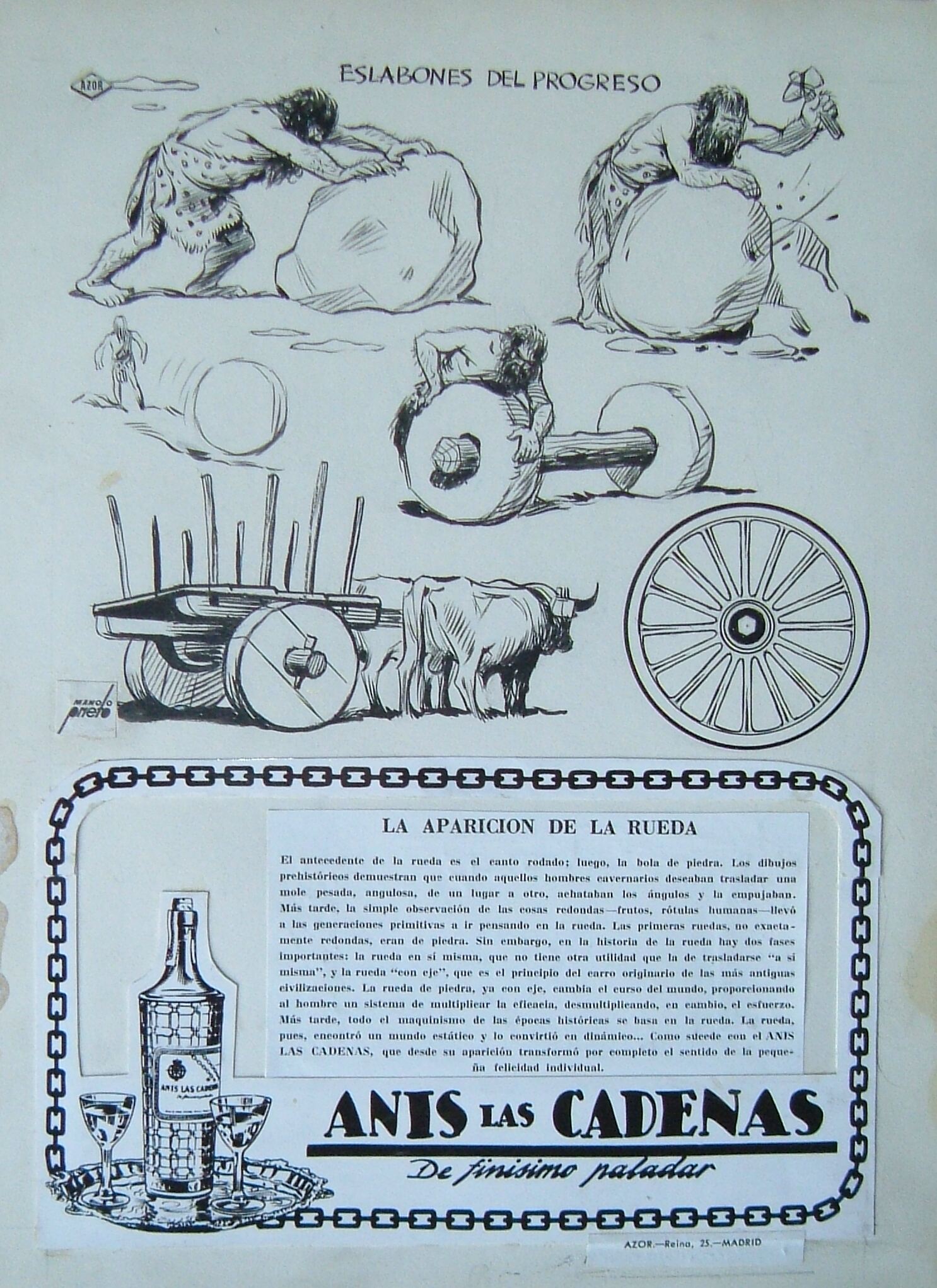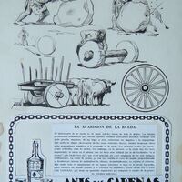 - Cartel donde en la parte superior aparece un letrero que dice “eslabones del progreso”, debajo composición de varios objetos relacionados con la aparición de la rueda, y en la parte inferior un recuadro formado por una cadena la imagen de una botella de anís y unas copas junto a una leyenda escrita con letra de imprenta.