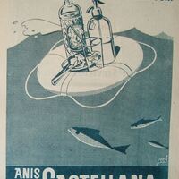 - Cartel con la imagen de un salvavidas en cuyo interior se puede apreciar una botella de anís otra de soda con un vaso lleno de hielos, debajo los rótulos correspondientes al anuncio.