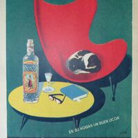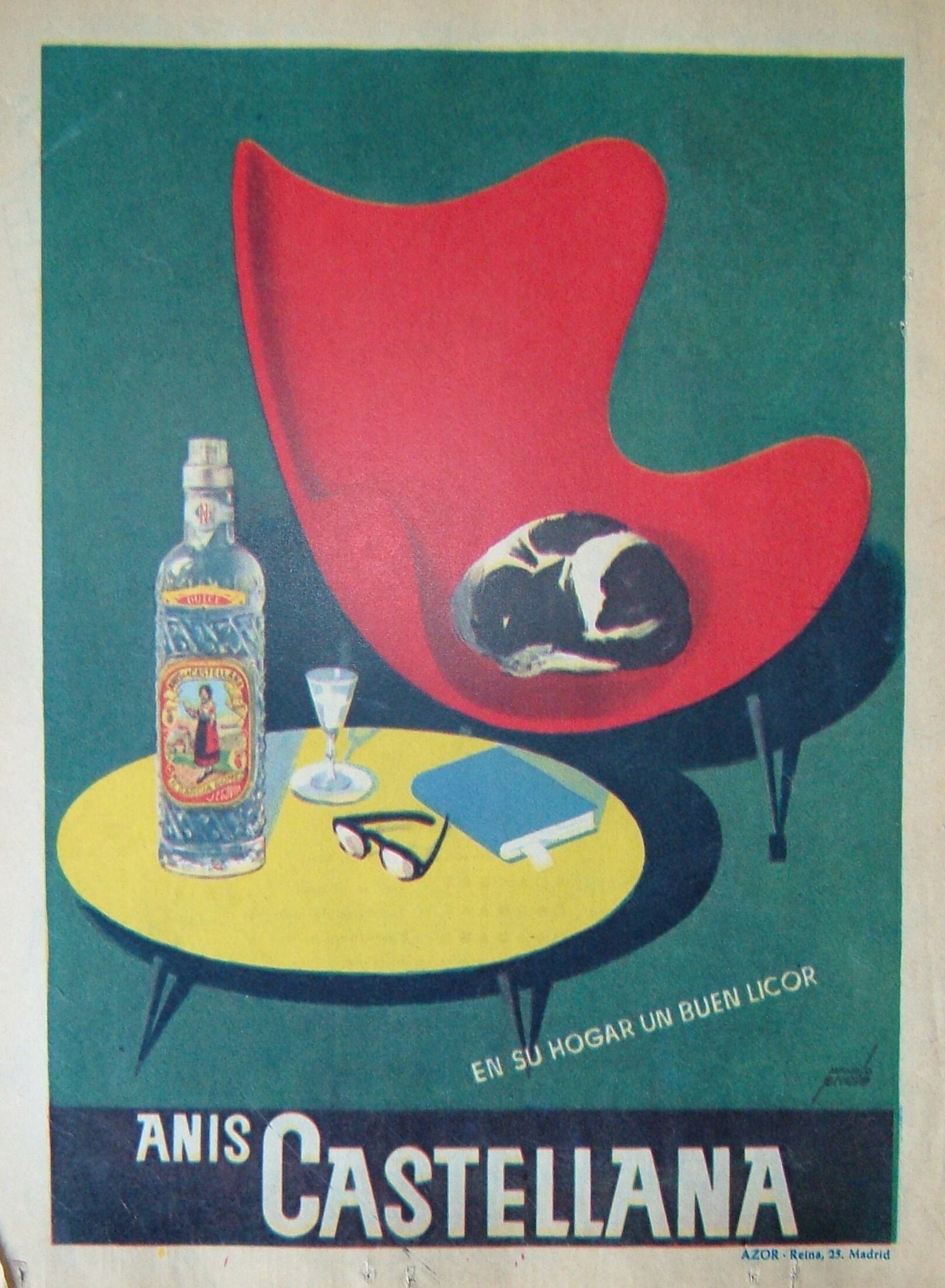 - Imagen con un fondo verde, donde podemos apreciar una silla de roja de diseño con un gato a manchas en su asiento enroscado sobre sí mismo durmiendo placidamente, junto a ella una mesa baja amarilla con una botella de anís, una copa, unas gafas y un libro, el rótulo del cartel en fondo negro.