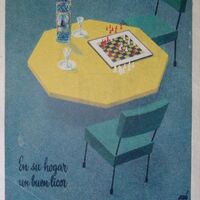 - Cartel con la imagen de una mesa octogonal amarilla, sobre ella un tablero de ajedrez cuyas figuras se aprecian en blancos y rojos, una botella y unas copas, junto a la mesa dos sillas verdes vacías.