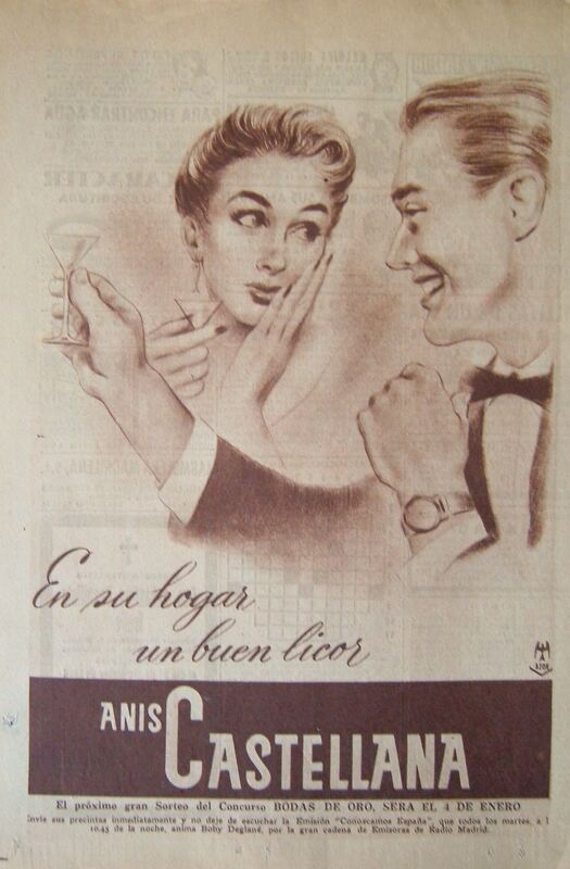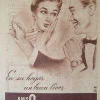 - Imagen que representa a una pareja con unas copas en la mano, el hombre con su mano levantada le dice algo a la mujer, que hace que se lleve una de sus manos a la cara un tanto ruborizada.