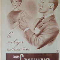 - Cartel que anuncia Anís Castellana, con la imagen en primer término de un hombre de perfil sonriente con traje de chaqueta mirando la copa que sujeta en su mano y al fondo, detrás de él, la figura de una mujer que parece conversar con él mientras sujeta en su mano una copa de anís.