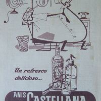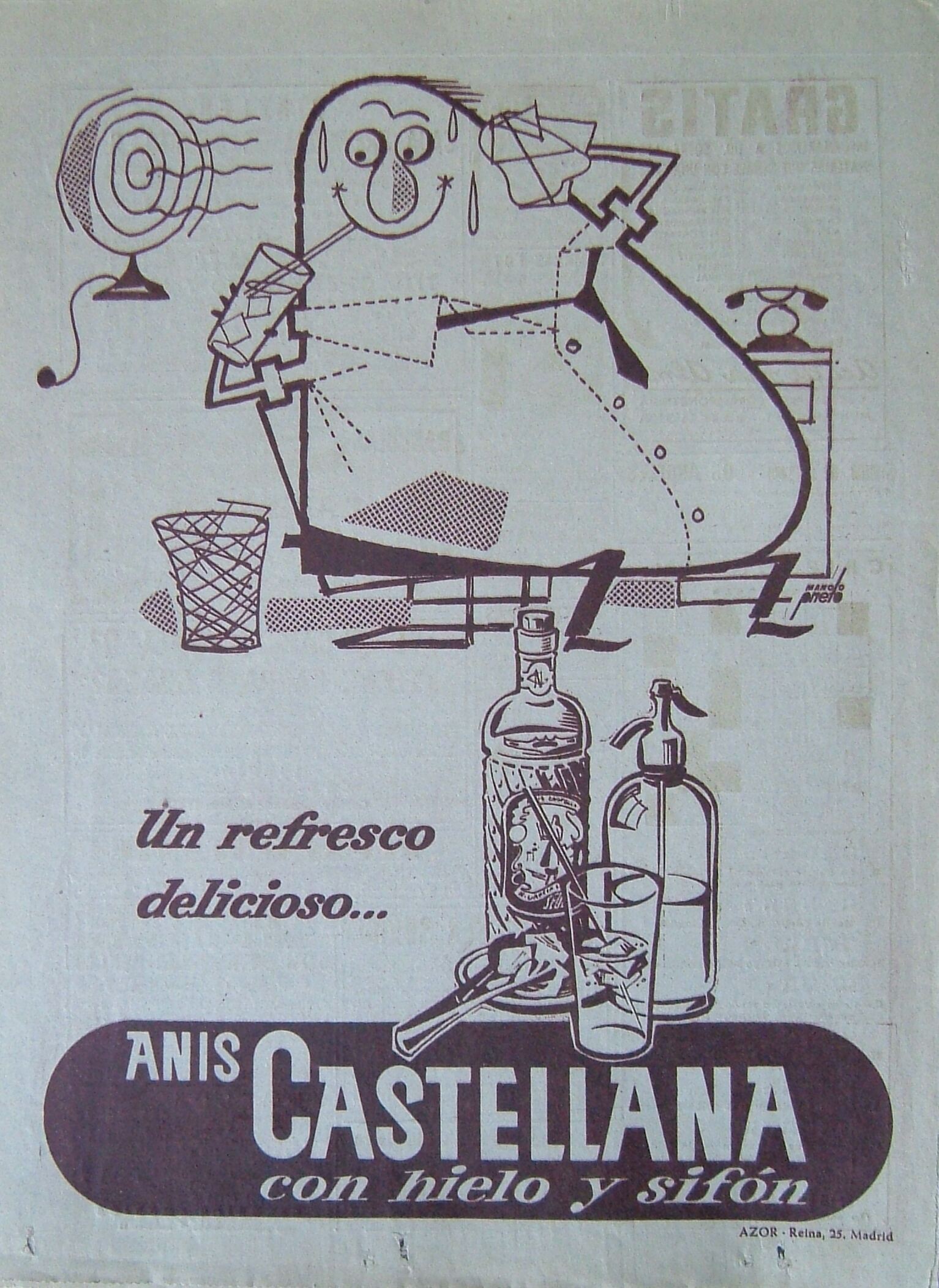 - Imagen de la silueta de un personaje caracterizado sentado frente a su mesa de trabajo que bebe un refresco para aliviar el calor mientras se seca con un pañuelo el sudor de su frente, debajo la imagen de una botella de anís, otra de sifón, un vaso y hielos junto a la leyenda correspondiente al anuncio.