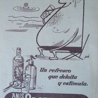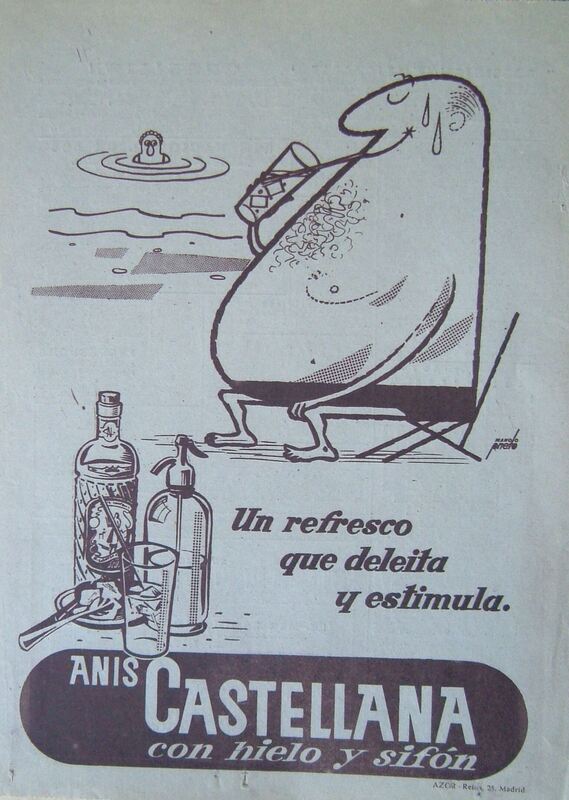 - Cartel con la imagen de un personaje caracterizado, sentado en una silla de playa bebiendo un refresco placidamente, debajo la leyenda del cartel junto al dibujo de una botella de anís, de sifón, un vaso y hielos.