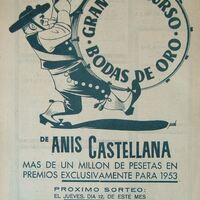 - Imagen de un hombre vestido con traje regional aragonés, con un gran bombo en cuyo interior se lee “Gran concurso, bodas de oro” correspondiente a un sorteo donde se premiará con un millón de pesetas.
