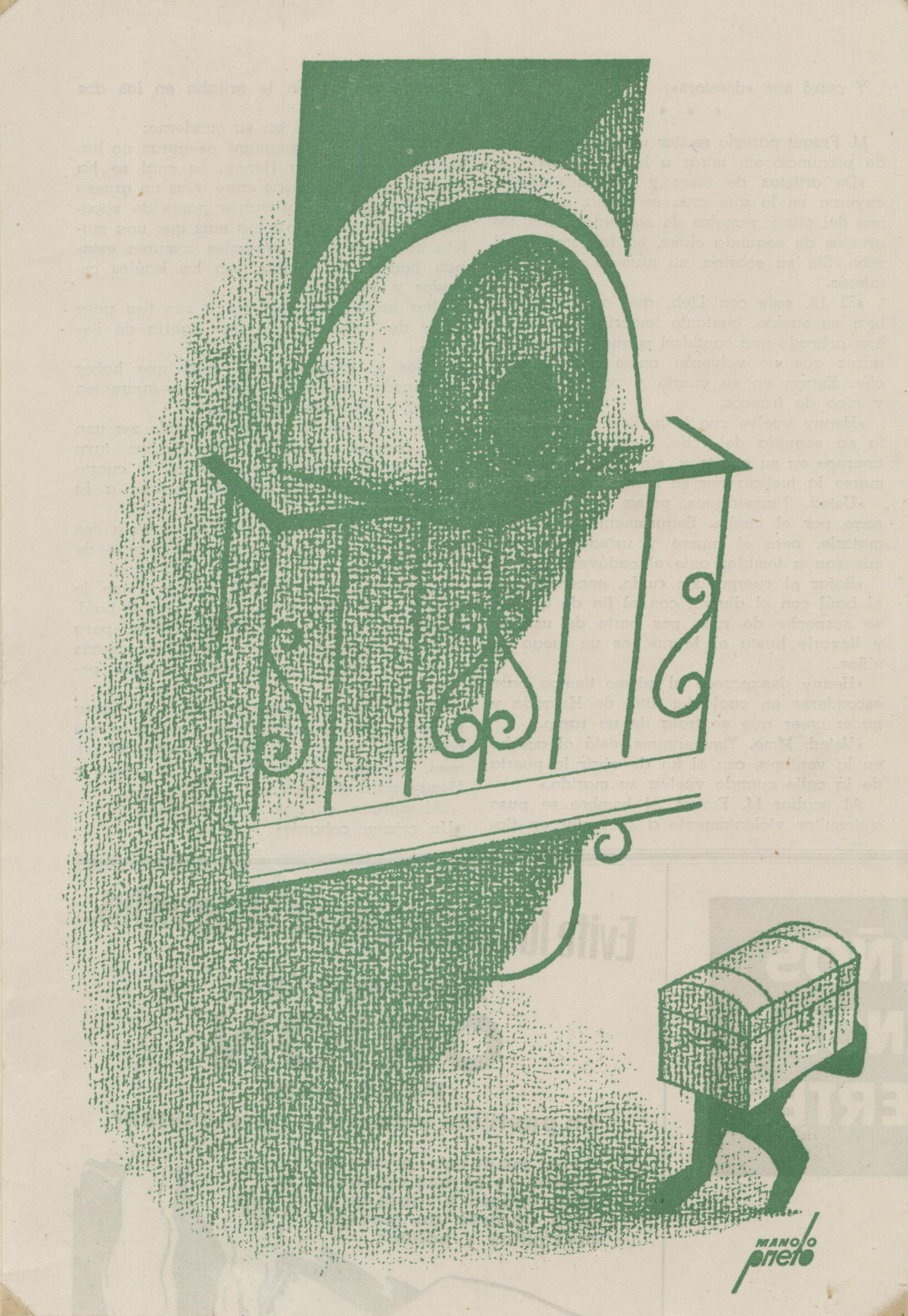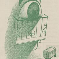 - Impresión sobre papel de un dibujo compuesto en tonalidades de verdes, donde observamos en un primer plano un balcón con un gran ojo que mira atentamente como un mozo transporta un baúl sobre sus espaldas.