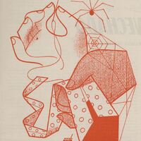 - Impresión sobre papel, en color rojo, de dos grandes manos, una de ellas sujetando una corbata de lunares y en la otra una aguja hilvanada. En la parte izquierda de la escena una tela de araña rematada por la figura de una araña.