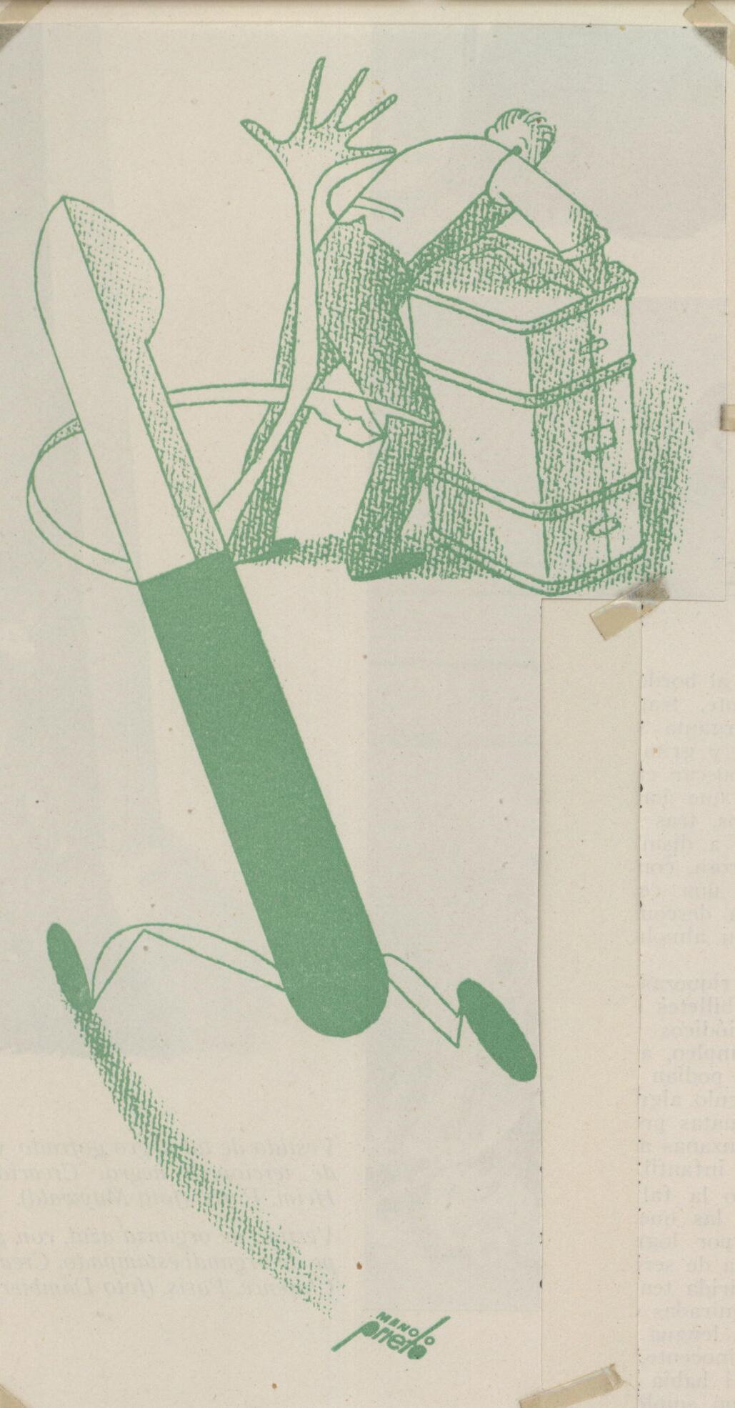 - Dibujo a lápiz verde, donde en primer término se aprecia un objeto alargado con mango caracterizado con manos que dirigen a un hombre que se encuentra en segundo plano portando o depositando una maleta.