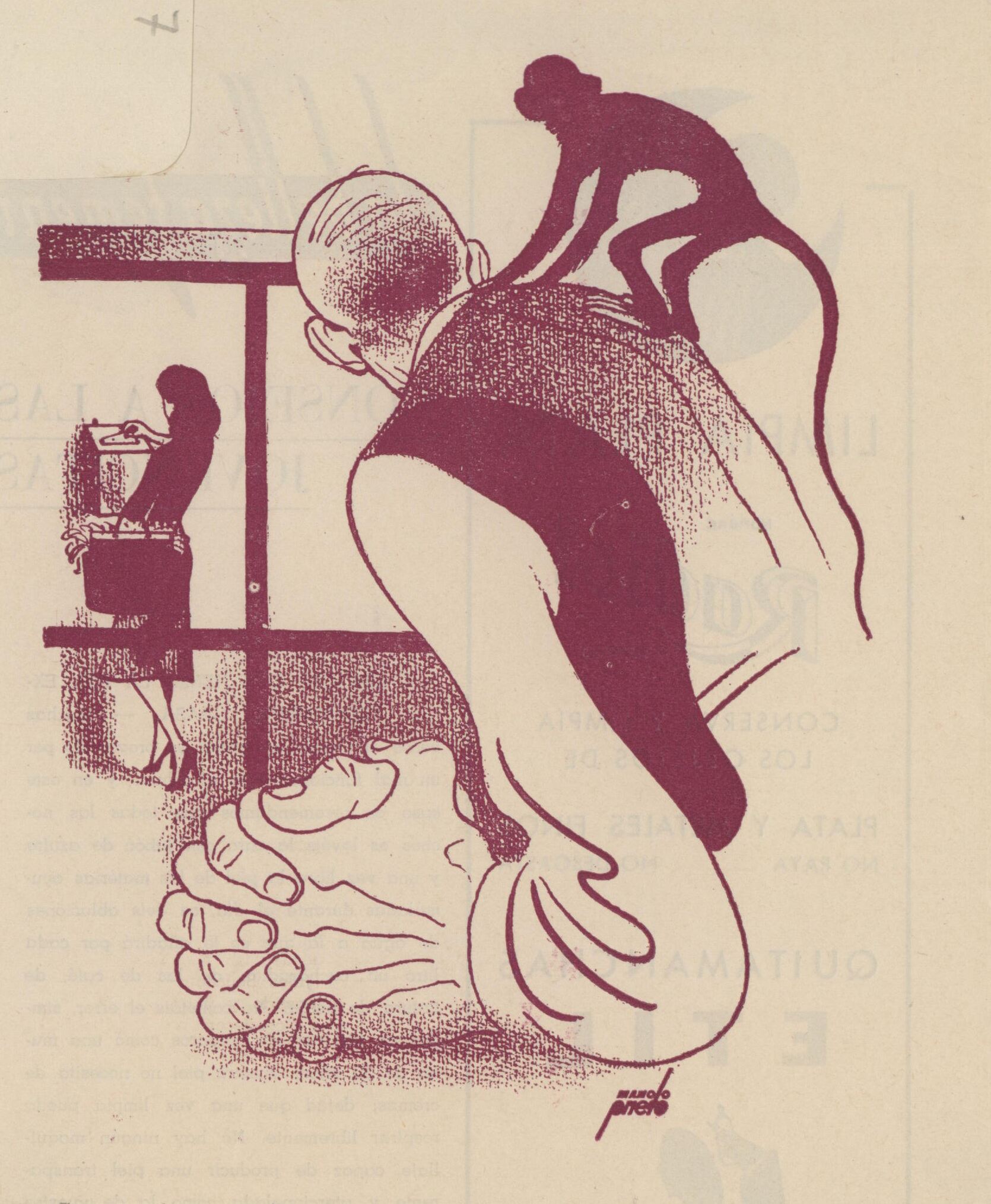 - En primer término de espaldas al espectador, la imagen de un hombre mayor de grandes manos con un mono subido a su hombro, que observa tras una ventana la figura de una mujer depositando una carta en un buzón.