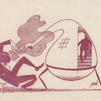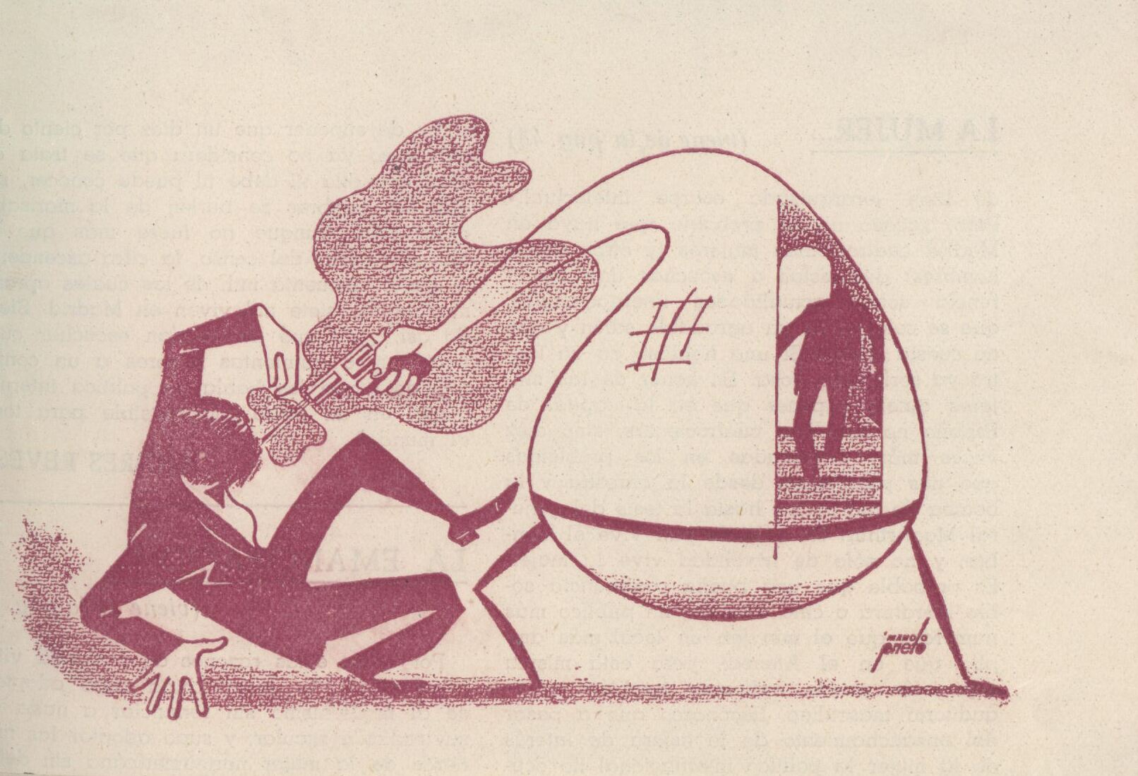 - Imagen de un hombre de perfil cayendo al suelo de ante un objeto caracterizado con patas y mano que sujeta una pistola, en el objeto se refleja la escena de un hombre de espaldas portando un maletín subiendo unas escaleras.