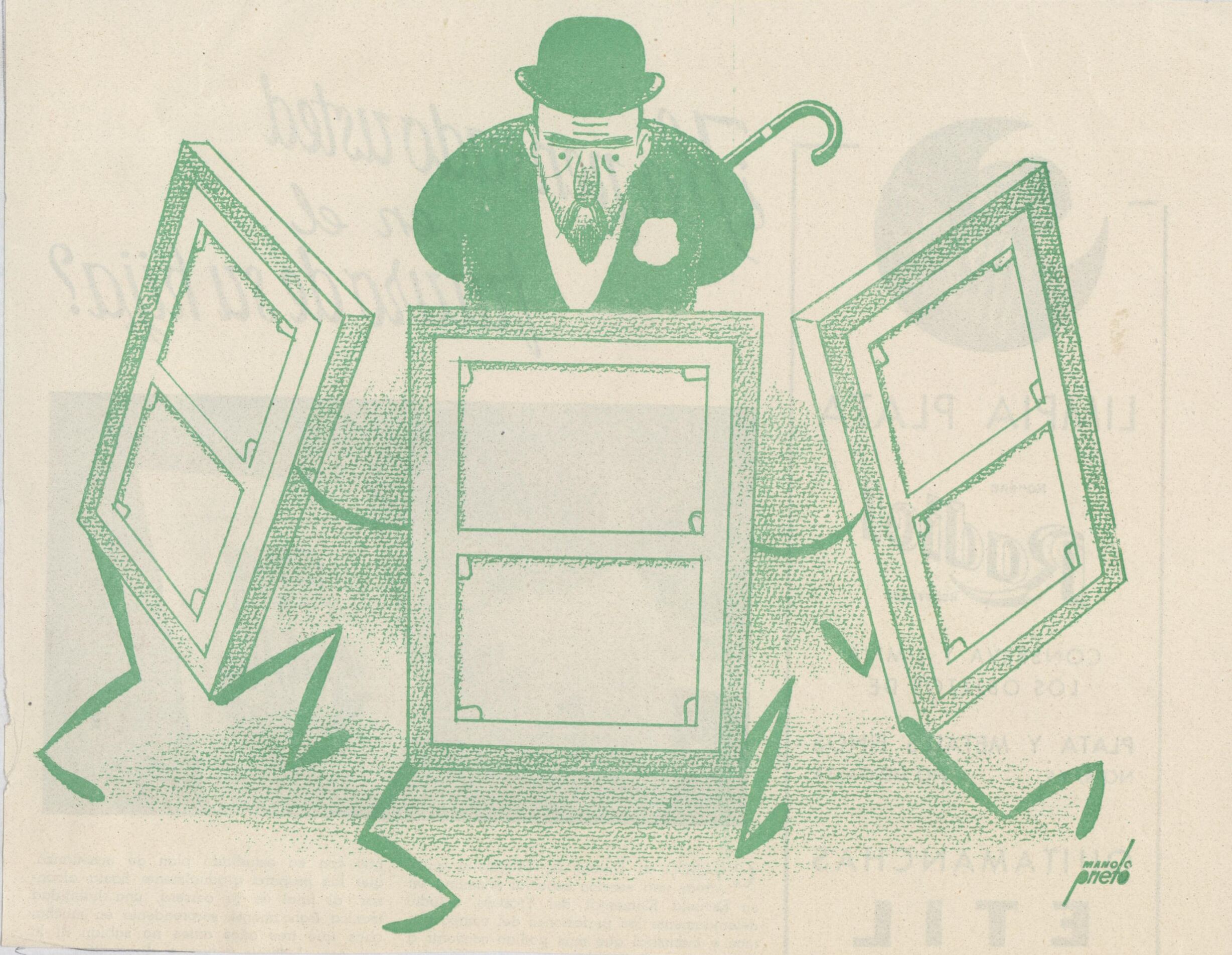 - En primer término la trasera de tres cuadros caracterizados, con patas frente a un hombre con bombín y bastón, parece que casi bailando, y que observa la escena con atención.
