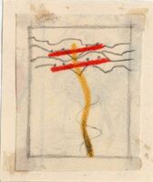 TORMENTA EN EL PUERTGO. Se representa un poste de la luz de colo amarillo sobre el poste dos palos horizontales dibujados de rojo en el que se sujetan cuatro cables dibujados a lápiz y con formas ondulantes.Boceto realizado para la ilustración de la revista semanal Novelas y Cuentos. Titulo: Tormenta en el puerto. Autor: Richard Dinbleby. Nº publicado: 1156 Fecha: 05-07-1953. Tomo NC.: 27.