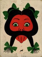 TODO QUEDA EN CASA. Un rostro femenino de color rojo, ojos verdes y con una larga cabellera negra se destaca en el centro de esta composición firmada por su autor. La disposición de su cabello, adornado con unos lazos verdes, rodea toda la cara atravesándose como su fuera un bigote por debajo de su nariz. Se ha pintado el rostro con la lengua de fuera.Prueba de imprenta. Ilustración realizada para la revista semanal Novelas y Cuentos. Titulo: Todo queda en casa. Autor: Margaret Millac. Nº publicado: 1002. Fecha: 23- 07-1950. Tomo NC.: 35.